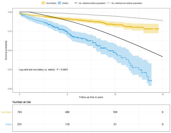Figure 2 shows the Kaplan–Meier curve of the long-term survival rate in elderly and non-elderly patients compared to the age-matched general Dutch population. Mean follow-up time was 6.2 ± 3.5 years. Long-term survival differed significantly between the elderly and non-elderly group with a p-value of <0.001. The five-year survival rate was 81.4% in the elderly and 93.9% in the non-elderly (p < 0.001) versus 86% and 98% in the age-matched general Dutch population. Moreover, survival in both study groups seemed lower than in the age-matched general Dutch population. Univariable analysis showed a history of hypertension (HR 2.64, 95% CI 1.21–5.78, p = 0.015) and diabetes mellitus (HR 0.24, 95% CI 0.06–0.97, p = 0.045) to be significantly associated with higher long-term mortality in the elderly, as well as in the non-elderly. In the non-elderly, male sex was significantly associated with a lower risk of long-term mortality, whereas in elderly patients this association was not found, as is shown in the Supplementary Materials.
