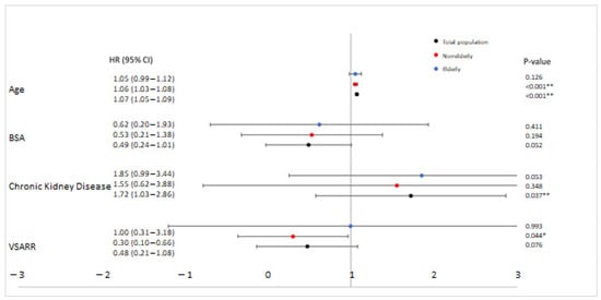 Figure 3 shows the multivariable analysis for the total population, and also for the elderly and non-elderly. Chronic kidney disease showed borderline significance with higher long-term mortality in the elderly (p = 0.053). In the non-elderly, higher age was associated with higher long-term mortality. Additionally, receiving Valve Sparing Aortic Root Replacement (VSARR) was associated with lower long-term mortality (the partial Yacoub technique was included in this multivariable analysis).