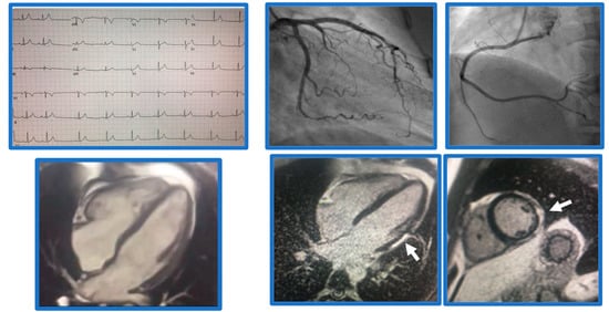 - Pathik, B.; Raman, B.; Mohd Amin, N.H.; Mahadavan, D.; Rajendran, S.; McGavigan, A.D.; Grover, S.; Smith, E.; Mazhar, J.; Bridgman, C.; et al. Troponin-positive chest pain with unobstructed coronary arteries: Incremental diagnostic value of cardiovascular magnetic resonance imaging. Eur. Heart J. Cardiovasc. Imaging 2016, 17, 1146–1152. [Google Scholar] [CrossRef] [PubMed]
