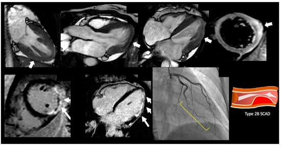 Based on a meta-analysis of studies using CMR as a diagnostic tool in patients presenting with a suspected diagnosis of MINOCA, myocarditis was shown to be the leading final diagnosis, identified in up to 38% of cases [17,18,20]. Other major identified causes include Takotsubo cardiomyopathy acute MI, and hypertrophic or dilated cardiomyopathy. After non-ischemic causes are excluded; the possible mechanisms for MINOCA include rupture of atherosclerotic plaque, coronary thrombosis and emboli, microvascular disease, coronary spasm, and spontaneous coronary artery dissection (SCAD). Coronary hemodynamic studies and further coronary imaging with optical coherence tomography (OCT) and intravascular ultrasound (IVUS) can be used successfully to evaluate the coronary etiology further [21].