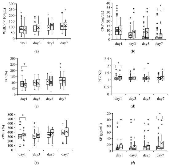 Coagulation parameters with minimal differences between survivors and nonsurvivors. Parameters with a minimal ability to predict severity are shown in (a–f). The boxplots show the median and interquartile ranges; “X” indicates the mean value. The circles show individual outliers. The white boxes denote survivors and the boxes with the dot pattern denote nonsurvivors. Data in nonsurvivors/survivors: (a) white blood cell count (WBC): 33/132 on day 1, 33/131 on day 3, 33/130 on day 5, and 31/115 on day 7; (b) serum C-reactive protein (CRP): 33/129 on day 1, 33/128 on day 3, 32/128 in day 5, and 31/112 on day 7; (c) serum protein C (PC): 26/103 on day 1, 23/89 on day 3, 25/86 on day 5, and 27/91 on day 7; (d) serum prothrombin time–international normalized ratio (PT-INR): 33/129 on day 1, 33/129 on day 3, 33/128 on day 5, and 31/112 on day 7; (e) serum von Willebrand factor (vWF): 26/103 on day 1, 23/88 on day 3, 24/86 on day 5, and 26/90 on day 7; and (f) serum soluble fibrin (SF): 25/102 on day 1, 23/88 on day 3, 25/86 on day 5, and 27/91 on day 7. The Student t-test or Wilcoxon signed-rank test was used for comparisons between survivors and nonsurvivors. * p < 0.05.