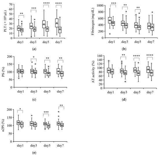 Coagulation parameters that were lower in nonsurvivors than in survivors. Parameters that were significantly lower in nonsurvivors than in survivors over the course of 7 days are shown in (a–e). The boxplots show the median and interquartile range; “X” indicates the mean value. The circles show individual outliers. The white boxes denote survivors and the boxes with the dot pattern denote nonsurvivors. Data in nonsurvivors/survivors: (a) platelet count (PLT): 33/129 on day 1, 33/129 on day 3, 33/127 on day 5, and 31/111 on day 7; (b) plasma fibrinogen: 33/129 on day 1, 33/129 on day 3, 33/127 on day 5, and 31/109 on day 7; (c) serum protein S (PS): 26/103 on day 1, 23/89 on day 3, 25/86 on day 5, and 27/91 on day 7; (d) plasma antithrombin activity (AT activity): 33/129 on day 1, 33/126 on day 3, 33/127 on day 5, and 31/110 on day 7; and (e) plasma α2 plasmin inhibitor (α2PI) 22/96 on day 1, 21/88 on day 3, 23/86 on day 5, and 24/91 on day 7. The Student t-test or Wilcoxon signed-rank test was used for comparisons between survivors and nonsurvivors. * p < 0.05, ** p < 0.01, *** p < 0.001, **** p < 0.0001.