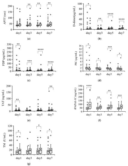 Coagulation parameters that were higher in nonsurvivors than in survivors. Parameters that were significantly higher in nonsurvivors than in survivors over the course of 7 days are shown in (a–e). The boxplots show the median and interquartile range; “X” indicates the mean value. The circles show individual outliers. The white boxes denote survivors and the boxes with the dot pattern denote nonsurvivors. Data in nonsurvivors/survivors: (a) plasma-activated partial thromboplastin time (APTT): 33/129 on day 1, 33/129 on day 3, 33/128 on day 5, and 31/111 on day 7; (b) serum D-dimer: 33/129 on day 1, 33/129 on day 3, 33/127 on day 5, and 31/111 on day 7; (c) plasma fibrin degradation products (FDP): 28/124 on day 1, 30/124 on day 3, 30/121 on day 5, and 31/111 on day 7; (d) plasmin/α2plasmin inhibitor complex (PIC): 26/103 on day 1, 23/89 on day 3, 25/86 on day 5, and 27/91 on day 7; (e) plasma thrombin/antithrombin III complex (TAT): 26/123 on day 1, 23/89 on day 3, 25/86 on day 5, and 28/91 on day 7; (f) plasma total plasmin activator and plasmin activator inhibitor-1 complex (tPAPAI-1C): 26/103 on day 1, 23/89 on day 3, 25/86 on day 5, and 27/92 on day 7; and (g) plasma thrombomodulin (TM): 25/101 on day 1, 23/89 on day 3, 23/84 on day 5, and 26/90 on day 7. The Student t-test or Wilcoxon signed-rank test was used for comparisons between survivors and nonsurvivors. * p < 0.05, ** p < 0.01, *** p < 0.001, **** p < 0.0001. First item.