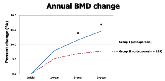 As both osteoporosis and LSS occur in elderly patients, the number of comorbid cases has been increasing. In a cross-sectional study, Lee et al. reported that osteoporosis or osteopenia was found in 79.2% of postmenopausal patients complaining of symptomatic LSS [19]. LSS causes various neuropathic symptoms and decreases the patient’s physical activity [9,20]. In our previous study, we demonstrated that BMD increases in only the osteoporosis group were greater than those of both the osteoporosis and LSS group for initially diagnosed osteoporosis treated with ibandronate [10]. In addition, only symptomatic LSS was a risk factor in the inhibiting persistent increase in BMD in the multivariate analysis. The results of the present study using three BPs are consistent with our previous study [10]. The annual increases in BMD were significantly greater in group I than those in group II (0.29 vs. 0.19 at one year; 0.13 vs. 0.06 at two years; 0.11 vs. 0.04 at three years). The total increase in BMD over three years was also significantly greater in group I (0.53 vs. 0.28). We suggested the mechanisms in a previous study. LSS causes neurologic claudication and decreases physical activity. Physical inactivity or walking difficulty due to claudication may be related to decreased BMD [21]. Physical activities can induce maintenance or increase BMD through a physical axial load. Therefore, active treatments for LSS should be undertaken to increase physical activity and BMD in patients with osteoporosis and LSS.