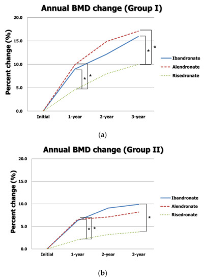 Annual changes in BMD according to type of BP in (a) group I and (b) group II. * indicates p < 0.05 in a post hoc analysis.