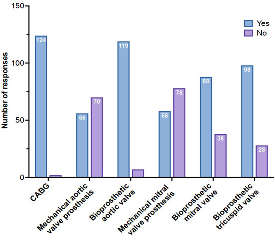 Number of respondents using low-molecular-weight heparin according to the type of cardiac surgery. CABG: coronary artery bypass graft.