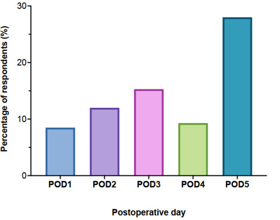 The main reasons given by the physicians for not using LMWH (n = 23) were a perceived increased risk of perioperative bleeding (22%), poor reversal compared with UFH (74%), local habits and/or the refusal of surgeons (57%), and its overly complex management (35%). Interestingly, even though the use of LMWH is not regulatory-agency-approved in France, in this setting (i.e., mechanical prosthesis), it was considered a hindrance for only a few respondents (n = 3). Among the respondents, 68% started vitamin K antagonists (VKAs) in the early postoperative setting when medically indicated, with the majority (28%) starting on POD + 5 (Figure 2). For many of the physicians, this was largely dependent on the absence of bleeding and on the chest tube and TEPW removal, which explains why the majority (47% of respondents) of them stated that they begin oral anticoagulation in the surgical ward, after most patients have already been discharged from the ICU on POD 3.
