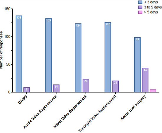Figure 3 depicts the current timing of the chest drainage removal according to the type of surgery. Most of the respondents removed the drains early (<3 days), even in aortic root surgeries. At the time of the chest pericardial and pleural drain removal, the dose was left unchanged, regardless of the dosage, for 72% and 80% of the respondents, respectively.