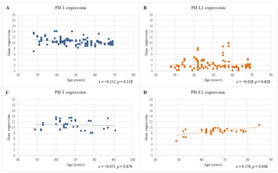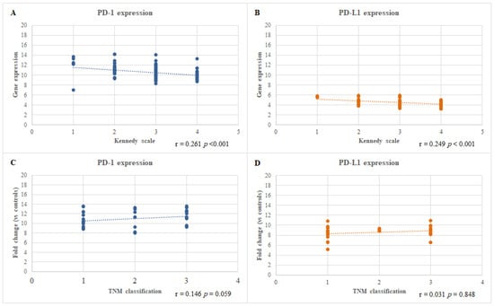 The Spearman correlation coefficient (r) was estimated to determine the linear association between the following variables: patient’s age and mRNA expression of the PD-1 and PD-L1 genes, extent of the disease and the mRNA expression of the PD-1 and PD-L1 genes. The outcome results were interpreted according to the degree of association as strong (r = 0.7–1), moderate (r = 0.5–0.7), or low (r = 0.3–0.5) after taking significant correlation (p < 0.05) values into consideration.
