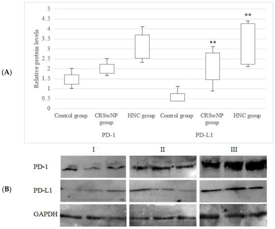 PD-1 and PD-L1 protein expressions in the tissue of the examined patients with CRSwNP and HNC (A). Representative Western blots of the PD-1 and PD-L1 protein expressions (B): control subjects (I); CRSwNP patients (II); HNC patients (III). ** p < 0.01 versus the control group.