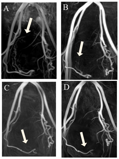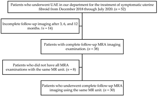 Technical advances in imaging acquisition now permit excellent visualization of the pelvic vasculature, even without the use of contrast medium [6,7,8,9,10]. Non-contrast-enhanced (NCE) magnetic resonance angiography (MRA) imaging before UAE is useful to demonstrate the origin of uterine arteries (UAs) from type I to type IV and its three-dimensional configuration, and to depict possible extra-collateral feeders to the tumor, such as the ovarian artery [7,8,10]. However, few studies have used NCE-MRA to examine changes in UA recanalization after UAE [11]. Here, we used NCE-MRA obtained at four time points to investigate luminal recanalization of UAs after UAE. From the aspect of patient care, recanalization affects two important points related to UAE: First, recanalization is necessary if embolization needs to be repeated in the case of inadequate symptom control, and second, recanalization is needed for maintenance of endometrial and myometrial perfusion after UAE [12,13].