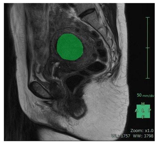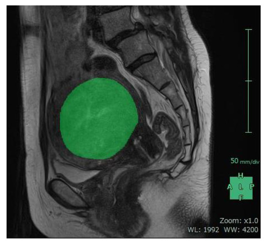 Sagittal MR image from a 48-year-old woman obtained before uterine artery embolization. The margins of the uterine tumor were delineated in sequential sagittal slices similar to those shown in green (mask).