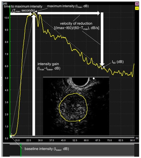 Quantitative evaluation using time–intensity curve (TIC) analysis for contrast enhanced endoscopic ultrasonography in malignant lymphoma. The region of interest is indicated by a yellow line. The following parameters were examined by TIC analysis. Baseline intensity (Ibase, dB)—echo intensity before contrast medium administration; I60—echo intensity at 60 s; maximum intensity (Imax, dB)—maximum echo intensity from Ibase to I60; time to maximum intensity (Tmax, s)—time to Imax from I; intensity gain (Imax − Ibase, dB)—intensity gain from Ibase to Imax; velocity of reduction ([Imax − I60]/[60 − Tmax], dB/s)—velocity of reduction from Imax to I60.
