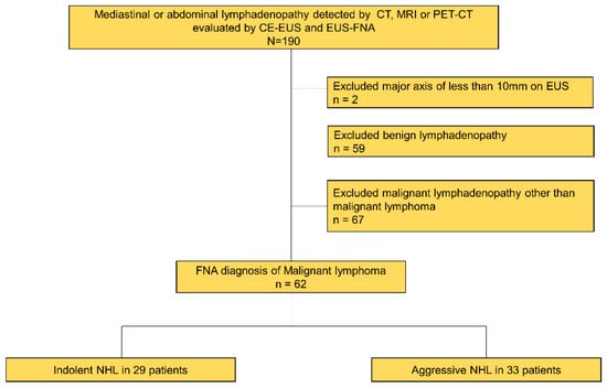 A total of 62 patients (36 male and 26 female) out of 188 patients who underwent EUS-FNA for mediastinal or abdominal lymphadenopathy around the upper gastrointestinal tract detected by computed tomography (CT), magnetic resonance imaging, or positron emission tomography (PET)-CT and diagnosed NHL were enrolled during the study period (Figure 2). The median age of the patients was 69 years (range 31–86). Four out of 62 lesions were mediastinal, and 58 out of 62 lesions were abdominal. The median follow-up period was 742 days (range 244–1322). The final diagnoses were aggressive NHL in 33 patients (diffuse large B-cell lymphoma in 27 patients, peripheral T-cell lymphoma in two patients, extranodal Natural Killer (NK)/T-cell lymphoma in 1 patient, plasmablastic lymphoma in one patient, T-cell lymphoma/histiocyte-rich B-cell lymphoma in one patient, and adult T-cell leukemia/lymphoma in one patient) and indolent NHL in 29 patients (follicular lymphoma in 27 patients, mantle cell lymphoma in one patient, and mucosa-associated lymphoid tissue (MALT) lymphoma in one patient). The baseline characteristics of study patients are presented in Table 1.