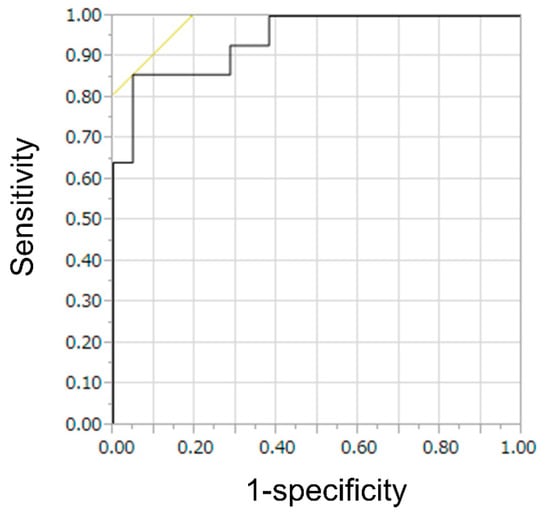 Table 4 presents the results of the TIC analysis. The TIC analysis showed no significant difference between indolent and aggressive NHL patients in heterogeneous enhancement. However, TIC analysis showed a significant difference in homogeneous enhancement. The VR was significantly faster in aggressive NHL compared to indolent NHL (p < 0.0001) (Figure 4). The ROC analysis of VR in homogeneous enhancement for indolent NHLs showed an area under the curve of 0.92 and a cut-off value of 0.16. dB/s (Figure 5). At this cut-off value, the sensitivity, specificity, and accuracy of the TIC analysis of aggressive NHLs of lesions with homogeneous enhancement were 86%, 95%, and 91%, respectively. The sensitivity, specificity, PPV, NPV, and accuracy of CE-EUS for aggressive NHL improved to 94%, 69%, 78%, 91%, and 82%, respectively, by combining qualitative and quantitative evaluations. The results of qualitative and quantitative evaluations in CE-EUS are presented in Table 5. CE-EUS combining qualitative and quantitative evaluations in differentiating aggressive NHL from indolent NHL resulted in a significantly higher accuracy rate than the qualitative evaluation of CE-EUS. (Table 6).