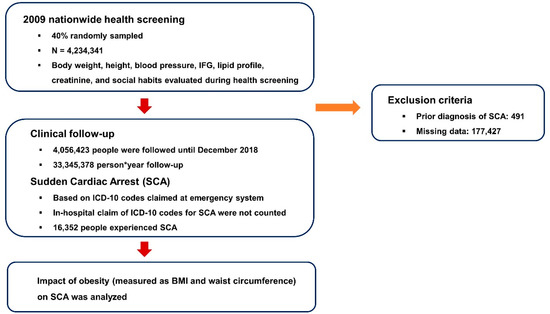 Obesity, which is associated with various medical diseases such as hypertension, diabetes mellitus, dyslipidemia, and coronary artery disease, is a major health concern in developed countries [1,2,3,4]. The association between obesity and coronary artery disease is of concern since it can lead to myocardial infarction or sudden cardiac arrest (SCA) [5,6,7,8]. A prospective cohort study involving 1 million adults in the United States revealed that the risk of all-cause death and cardiovascular death was significantly increased in obese people [8]. Another study with 2.3 million adolescents from Israel with 40 years of follow-up demonstrated that obesity during adolescence was associated with significantly increased all-cause and cardiovascular mortality in adults [7]. A study from the Republic of Korea also found a significant association between obesity and all-cause mortality [9]. In these studies, body weight status such as normal weight, overweight, and obesity was defined using body-mass index (BMI) criteria, an indicator of general obesity [7,8,9].