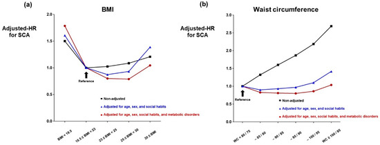 The influence of waist circumference and BMI on risk of SCA was evaluated. Waist circumference was measured as the mid-point between the rib cage and the iliac crest. Waist circumference was classified into six stages: waist circumference < 80.0 (cm), 80.0 ≤ waist circumference < 85.0, 85.0 ≤ waist circumference < 90.0, 90.0 ≤ waist circumference < 95.0, 95.0 ≤ waist circumference < 100.0, and waist circumference ≥ 100.0 for males, and waist circumference < 75.0, 75.0 ≤ waist circumference < 80.0, 80.0 ≤ waist circumference < 85.0, 85.0 ≤ waist circumference < 90.0, 90.0 ≤ waist circumference < 95.0, and waist circumference ≥ 95.0 for females. Body-mass index was classified into five groups: low body weight (BMI < 18.5 [kg/m2]); normal body weight (18.5 ≤ BMI < 23.0); pre-obesity (23.0 ≤ BMI < 25.0); obesity class I (or mild obesity, 25.0 ≤ BMI < 30.0); and obesity class II-III (or moderate to severe obesity, BMI ≥ 30.0) [21,22].