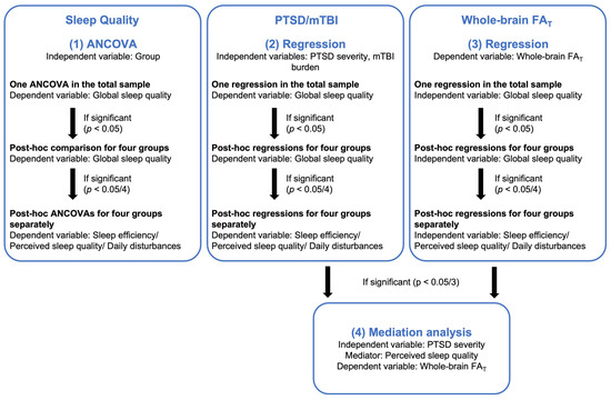 Hierarchical statistical approach. Note. PTSD, post-traumatic stress disorder; mTBI, mild traumatic brain injury; PSQI, Pittsburgh Sleep Quality Index; FAT, fractional anisotropy tissue. This figure illustrates the hierarchical statistical approach.