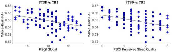 Association between sleep quality and whole-brain FAT. Note. PSQI, Pittsburgh Sleep Quality Index []; PTSD, post-traumatic stress disorder; mTBI, mild traumatic brain injury; FAT, fractional anisotropy tissue. This figure illustrates the significant negative association between global sleep quality and whole-brain FAT (p < 0.001) and between perceived sleep quality and whole-brain FAT (p < 0.001). Lower scores on the PSQI scales represent better sleep quality.