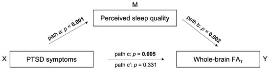 Given the significant association between PTSD symptom severity and perceived sleep quality and between perceived sleep quality and WM microstructure in the comorbid PTSD+mTBI group, we performed additional mediation analyses to assess whether perceived sleep quality mediates the association between PTSD symptom severity and whole-brain FAT. When not including sleep in our model we observed an effect of PTSD symptom severity on whole-brain FAT (b = −0.00, SE = 0.00, t(91) = −2.88, p = 0.005, Figure 3 path c). When including perceived sleep quality as a mediator, the relationships between PTSD symptom severity and perceived sleep quality (b = 0.02, SE = 0.00, t(91) = 5.55, p < 0.001, Figure 3 path a), perceived sleep quality and whole-brain FAT (b = −0.00, SE = 0.00, t(90) = −3.26, p = 0.002, Figure 3 path b), and the model’s total effect (F(3, 90) = 6.81, R2 = 0.19, p < 0.001) were significant. However, the direct effect of PTSD symptom severity on whole-brain FAT was not statistically significant (b = −0.00, SE = 0.00, t(90) = −0.97, p = 0.331, Figure 3 path c’). The findings indicate that the association between PTSD symptom severity and whole-brain FAT is statistically mediated by perceived sleep quality. When the mediation model included psychiatric comorbidities (anxiety, depression, and substance use disorder), warzone-related stress, BMI, psychiatric medication use, race, and education as additional covariates, results did not change significantly.