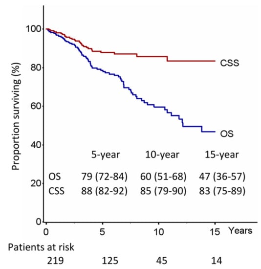 The median OS was 146 months, with 5-, 10-, and 15-year OS rates of 79%, 60%, and 47%, whereas the CSS at 5-, 10-, and 15-year were 88%, 85%, and 83%, respectively (Figure 1).