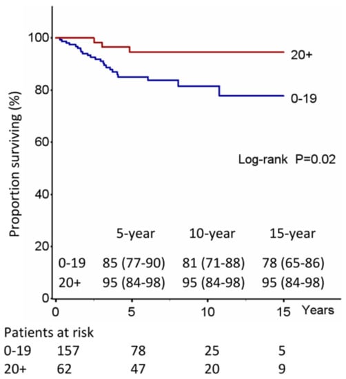 In our study, the incidence of relapse rates at 5-, 10-, and 15-year were 23%, 31%, and 32%, respectively, and significantly associated with the number of lymph nodes removed (p = 0.01); moreover, in a subgroup analysis, patients with more than 20 lymph nodes removed and clinical stage I had a probability of relapse significantly lower than patients with less than 20 lymph nodes removed or clinical stage II (p = 0.02) (Figure 4). Additionally, the number of lymph nodes removed was also an independent prognostic factor of CSS (p = 0.02), making it the only high-risk factor related to survival, unlike size and visceral pleura which, on the other hand, did not correlate with either survival or risk of recurrence.
