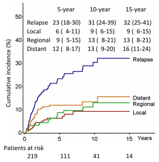 A total of 55 (25.1%) patients developed recurrences of the disease (Table S1 and Figure 1): 15 (6.8%) had local relapse, 18 (8.2%) regional recurrences, and 26 (11.9%) distant metastases (2 patients had simultaneous local and distant relapse and 1 patient simultaneous local, regional and distant relapse).