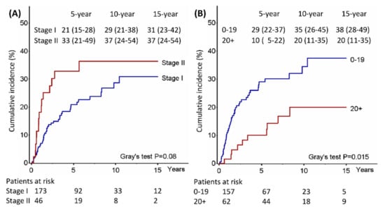 The cumulative incidence of relapse at 5-, 10-, and 15-year was 23%, 31%, and 32%, respectively (Figure 3), and related to clinical stage (p = 0.08) and number of LNs removed (p = 0.01) (Figure 4 and Table 2); patients with more than 20 LNs removed and clinical stage I had a significantly lower probability of relapse than patients with less than 20 LNs removed or clinical stage II (p = 0.02) (Figure S1), whereas the CSS was significantly related only to the number of LNs removed (p = 0.02).