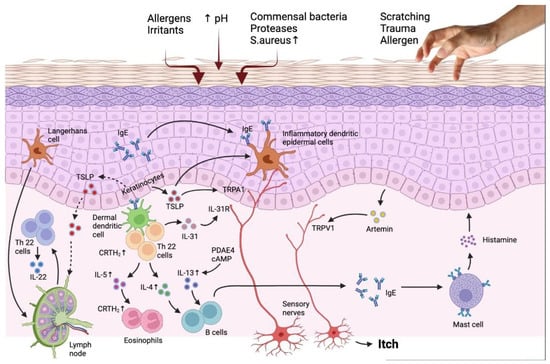One of the distinguishing characteristics of atopic dermatitis (AD) is chronic pruritus. Between 87 and 100% of AD patients have chronic pruritus at any given time [33,34]. Studies have distinguished histamine-sensitive and histamine-insensitive pruriceptive sensory nerves in the cutaneous neuronal network (Figure 1, Table 1).