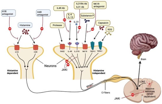 The Janus kinases (JAKs) are protein tyrosine kinases (TYKs) that bind to transmembrane type 1 and type 2 cytokine receptors and mediate cellular responses to numerous cytokines and growth factors; these mediators are important in immune defense and in immune-mediated disease [201]. Persistent pruritus in AD leads to scratching, which in turn triggers STAT3 activation in astrocytes of the spinal dorsal horn. Activation of lipocalin (LCN) 2 by astrocytes sensitizes a pruritus-processing neural network made up of GRPR1 spinal dorsal horn neurons, which in turn causes chronic pruritus and the cycle of itch and scratch [35,202] (Figure 2).
