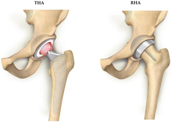 Total hip arthroplasty (THA) is the mainstay of treatment for patients with end-stage hip osteoarthritis. It is largely performed worldwide and demonstrates a proven record of success [1]. In the last two decades, resurfacing hip arthroplasty (RHA) has been developed as a potential alternative to THA in selected subgroups of young and active patients, aiming for higher femoral bone stock preservation (Figure 1) [2,3,4]. In the late 1990s and early 2000s, the lack of knowledge about RHA design, tribology and mechanical properties had led to much interest but also to this procedure being abandoned. In this respect, the biggest downsides of this procedure are that it cannot be performed in all hip cases and that it has a rather long learning curve [5]. However, several surgeons worldwide are reconsidering the RHA technique benefiting from a more anatomical treatment approach. Registries in several countries report favorable results for RHA [6], leading to a renewed interest in this procedure and to RHA gaining ground over THA with certain designs and in selected patient subgroups [7]. Apart from minimal bone resection, other theoretical advantages of RHA include improved joint stability, better reproduction of native hip biomechanics and diminished linear wear. Some studies have also suggested a functional advantage for hip resurfacing suggesting even higher function scores in patients who had undergone RHA instead of THA [7]. However, concerns with metal ions that are potentially generated in RHA have led to a dramatic reduction in the use of hip resurfacing and to the withdrawal of some implants [8,9,10].