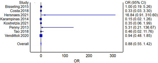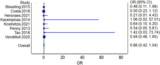 Eight studies reported the number of complications for the RHA (325 patients in total) and THA procedures (347 patients in total). The overall odds ratio (OR) analysis found a value of 0.66 in favor of RHA, although without reaching a statistically significant difference between the two groups (p = 0.071) (Figure 4).