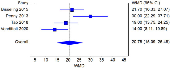 UCLA: Forest plot of the individual studies and pooled mean difference for UCLA improvement, including a 95% confidence interval. The size of the squares shows the weight of the study [17,18,19,20,25,28,29,30,31].