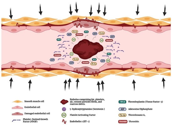 Several postmortem and echocardiographic studies in the literature suggested this model. Postmortem studies on animals and humans have revealed pulmonary embolization and echocardiographic studies detected the presence of emboli in the right atrium, right ventricle and pulmonary artery intraoperatively. It has been established that these emboli contain fat, marrow, air, bone particles, cement particles, and aggregates of platelets and fibrin. The effects of these emboli are believed to be either due to mechanical effects, mediator effects or both [8,24]. The pathophysiology of this model is shown in Figure 1.