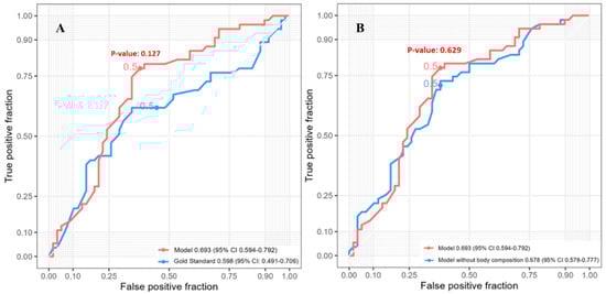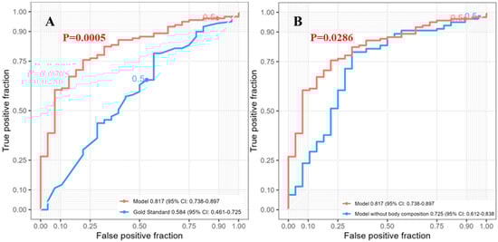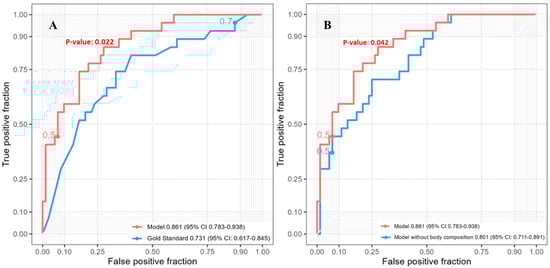 The five-year survival had 99 patients included in the analysis. The SVM model for predicting five-year post-esophagectomy survival outperformed other models (Supplemental Figure S4) with an AUC of 0.861 (95% CI: 0.783–0.938). This model incorporated four radiomic features (mean, root-mean-squared mean, median, and 10th percentile intensity), three clinical features (age, BMI, pathological T-stage), one tumor feature (mean diameter), and two body composition features (VAT mass and IMAT volume) (Supplemental Table S4). Compared to the reference model with an AUC of 0.731 (95% CI: 0.617–0.845), the SVM model’s performance was significantly better (Figure 3A, p = 0.022). The full SVM model, including body composition variables, performed significantly better than the model without body composition variables (p = 0.042), which had an AUC of 0.801 (95% CI: 0.711–0.891) (Figure 3B).