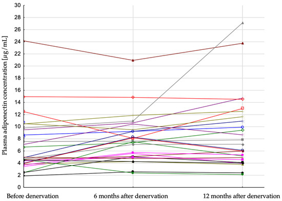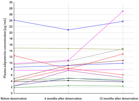 Plasma adiponectin concentration in patients after renal artery denervation in all studied patients. Each line represent result of single patient.