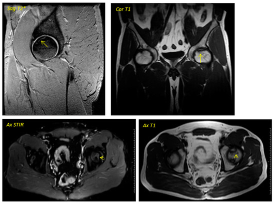 Early diagnosis of this disease is of utmost importance since the greatest effectiveness of treatments is obtained in the early stages. The main problem is that the clinical presentation is typically asymptomatic in these stages, and when the clinical presentation becomes more florid, the disease has usually advanced. Conventional radiographs show signs such as the crescent line, characteristic of the existence of subchondral fracture, as well as the loss of sphericity of the head due to collapse, joint narrowing, or arthrosis changes [11]. Magnetic resonance imaging (MRI) is the outreach diagnostic test [12]. MRI testing of ONFH shows the so-called double-lined sign, characterized by low-intensity signals at T1 and jointly low or high-intensity signals at T2, which reveals an interface between normal tissue and hypervascularized granulation tissue, distinctive of initial necrotic changes.