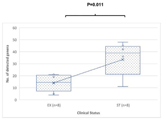 Comparison of the number of genera from sputum specimens from patients in the EX versus ST states. The p-value was = 0.011 using the Mann–Whitney U test. The median is represented by a horizontal line inside each box, (x) represents the mean, the interquartile range is indicated by the boxes, and the whiskers denote the range. The numbers of detected genera represent the numbers of any genera with a relative percentage abundance of greater than 0%.