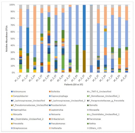 The quantity of discovered genera was substantially more in the ST sputum samples than in the EX sputum samples (p-value = 0.011) (Figure 2). The total number of reported genera was the total number of genera having a relative percentage abundance >0%.