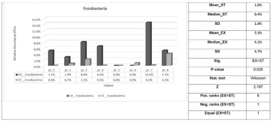 Fusobacteria phylum distribution of sputum samples from eight ACO patients in the EX versus ST states. Sig: indicates whether a statistically significant difference exists (p-value < 0.05) between EX and ST; Stat. test: the statistical test used; Z: standardized test statistic; Pos. ranks: the number of positive differences between EX and ST in the paired samples; Neg. ranks: the number of negative differences between EX and ST in the paired samples; Equal: the number of patients where there was no difference between EX and ST. ST: stable; EX: exacerbation; SD: standard deviation.