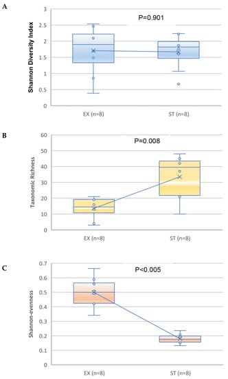 No significant difference was observed (p = 0.901, paired Student’s t-test.) in the diversity of the microbial community (Shannon–Wiener diversity index) (Figure 5A). A significant increase was observed in the median and mean taxonomic richness and a significant reduction was observed in the median and mean evenness of the ST-related sputum samples compared with the EX samples (p = 0.008 and <0.005, respectively; paired Student’s t-test) (Figure 5B,C).