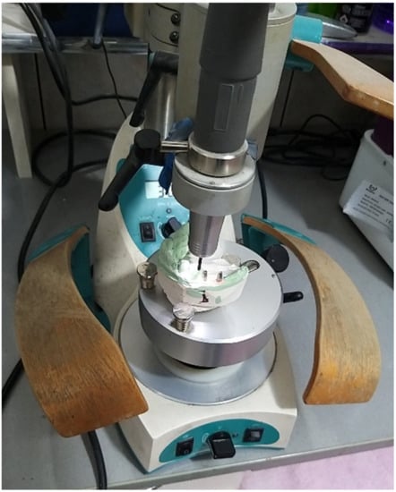 The dental impressions were received in the laboratory both in an analog and digital format, and the functional working casts were either composed of plaster, or a specific 3D-printed resin. The dentist and the dental technician analyze the axis of insertion of the implant and choose a stock prosthetic abutment as close as possible to the ideal position for the insertion of the future implant-prosthetic restoration. The cast is fixed in the Parallelograph by the technician, then the grinding parameters are set, and the standard abutment is roughened to obtain the desired axis and, implicitly, the parallelism of the abutment (Figure 1).