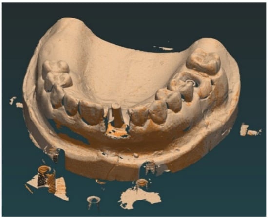 At the end, the dental technician verifies if there is enough space for the implant-prosthetic restoration, then proceeds to the stage of scanning the cast in occlusion with the fixed prosthetic abutment (Figure 2), and then designs the future superstructure in Exocad design software.