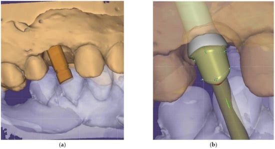 Among the most popular CAD software, there are Exocad, 3Shape, or DentalWings, and among the CAM software, the most used are hyperDENT, CIMSystem-Millbox, or WorkNC. In addition to the already common materials currently milled in dental laboratories, namely zirconia, ceramic, PEEK, PMMA, or wax, manufacturers have offered the possibility of milling metal, such as Chrome-Cobalt or titanium. Last but not least, dental laboratories can currently mill customized titanium prosthetic abutments, either from prefabricated abutments also known as pre-mill abutments, or by milling directly into the titanium disc. The prefabricated abutments are sold with the interface that connects to the implant already industrially milled by the manufacturer, so that only the area of the emergence profile, the cervical line, and the prosthetic abutment are milled in the laboratory. The possibility to mill the complete abutment, including the implant interface, into the titanium disk represents an advanced feature of CAM software and it is only employed by experienced dental technicians. Currently, dental laboratories are customizing prosthetic abutments, either analogically by milling stock prosthetic abutments, or digitally by designing and milling custom abutments using CAD-CAM technology. Custom prosthetic abutments based on CAD-CAM technology have started to be used more and more, because they can be adjusted to each situation, and also because other materials besides titanium may be used, such as zirconia, ceramic, PEEK, or BioHPP [,].