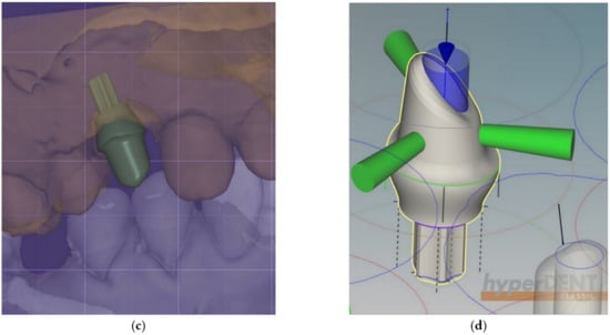 (a) Scanning of the scanning abutment to allow the virtual transfer of the implant position, taking the information from the scanning software and loading it into the Exocad design software; (b) the design of the prosthetic abutment; (c) prosthetic abutment with connection; (d) loading in the hyperDENT Classic software and computing the milling parameters.