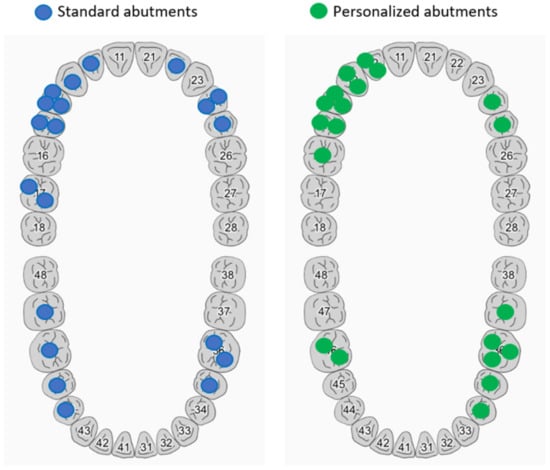 There are authors who believe that standard abutments represent an optimal solution because they are not expensive, save time, and avoid the phenomenon of corrosion that can be found in some alloys from which implant-prosthetic abutments are milled []. Another advantage of standard abutments comes from the fact that the industrial production process is always standardized in terms of product quality to ensure biocompatibility of the materials used [].