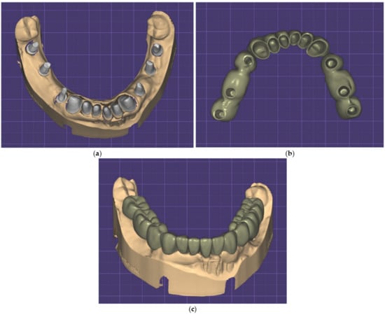 (a) Aspect of the scanned working cast, with stock milled abutments and customized CAD-CAM abutments; Bredent standard abutments 44, 46, 47; custom CAD-CAM abutments with Bredent connection 34, 36, 37; (b,c) the design of the front dental prosthetic restoration and the two lateral implant-prosthetic restorations.