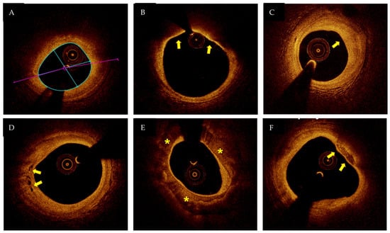 OCT (optical coherent tomography image): (A) lipid-rich plaque; (B) thin-cap fibroatheroma (arrows); (C) fibrous plaque (arrow); (D) neovascularization (arrows); (E) calcification (asterisks); (F) spotty calcium (arrow). Figure from authors’ library.