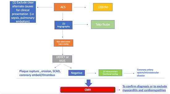 The European Society of Cardiology (ESC) working group established a diagnostic protocol that include a complete medical history, physical examination, laboratory tests, imaging, and invasive procedures to uncover the underlying cause of MINOCA [].