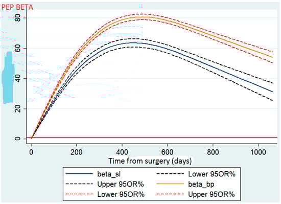 The last 30 years have brought a dramatic increase in the worldwide prevalence of obesity, causing considerable social and economic burden [,,]. There is strong evidence that bariatric surgery, compared with medical treatment alone, results in substantial and long-term weight loss in morbidly obese patients [,,]. Laparoscopic sleeve gastrectomy (LSG) and laparoscopic Roux-en-Y gastric bypass (LRYGB) are currently the two most frequently performed procedures in bariatric surgery, and weight loss is considered to be the primary indicator of its success [,]. At least 70 randomized controlled trials (RCTs) or observational studies (OS) have directly compared LRYGB and LSG [,,,,,,,]. While the majority of RCTs have shown that patients undergoing LRYGB and LSG experience similar weight loss [,,,], OS have shown that LRYGB patients achieve greater weight loss than LSG patients [,]. Furthermore, in daily practice, the choice of procedure is based on a shared decision-making process [] (i.e., patients’ own preferences and values, comorbidities, intraoperative findings, and surgeons’ expertise and habits) that may not be measured in RCTs; hence, there is interest in complementary observational studies. Finally, traditional approaches to assess long-term weight loss in bariatric surgery have relied on a single time-point analysis, either through bivariate or regression models. However, this analysis requires, from a statistical point of view, to take into account the presence of repeated weight measurements for the same individual over time. To preserve this hierarchical structure, multilevel mixed-effects linear models should be used to assess weight loss over time [].